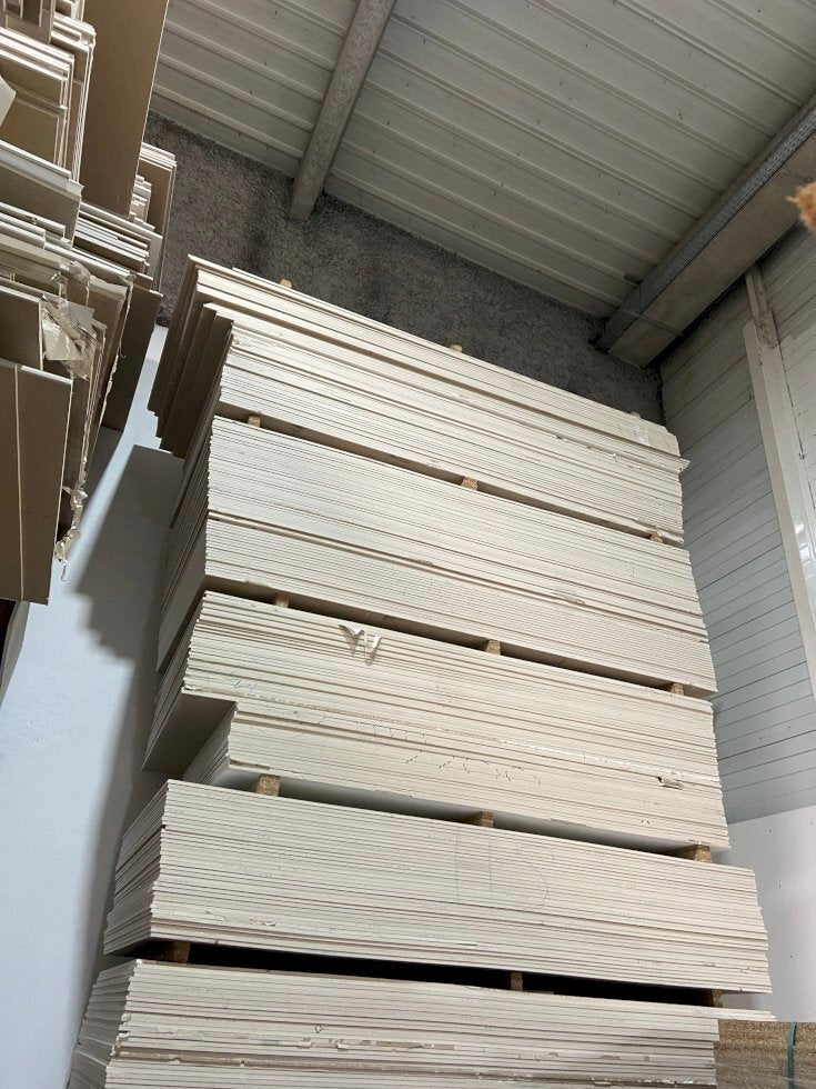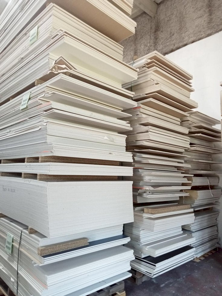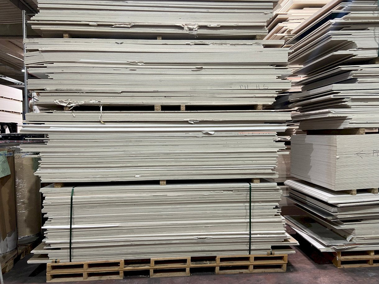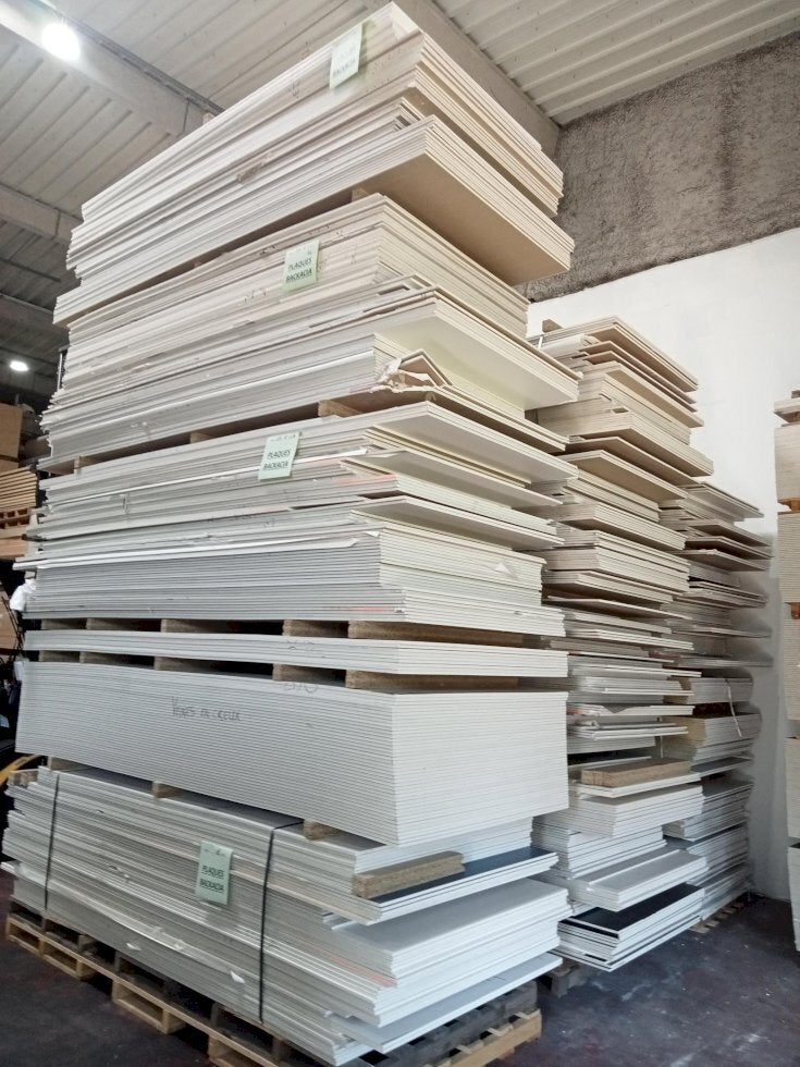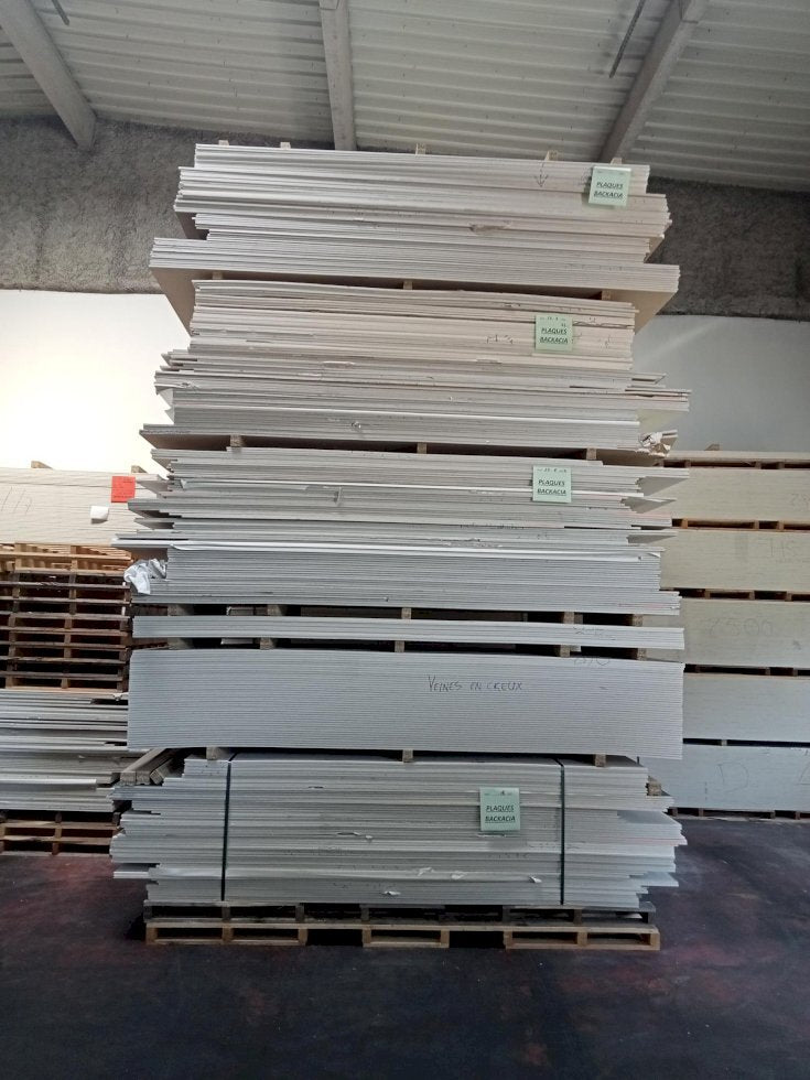 Plaques de plâtre bord droit en 13mm d'épaisseur "BD13" issues de surplus ou présentant de légers défauts de production, vendues en l'état. Vente en lot, à la palette : chaque palette comprend une cinquantaine de plaques. Présence d'irrégularités minimes (défauts esthétiques, épaisseurs approximatives) et aléatoires sur les plaques. Les palettes sont vendues avec un mixte de plaques qui sont brutes et revêtues (revêtement papier ou vinyle).